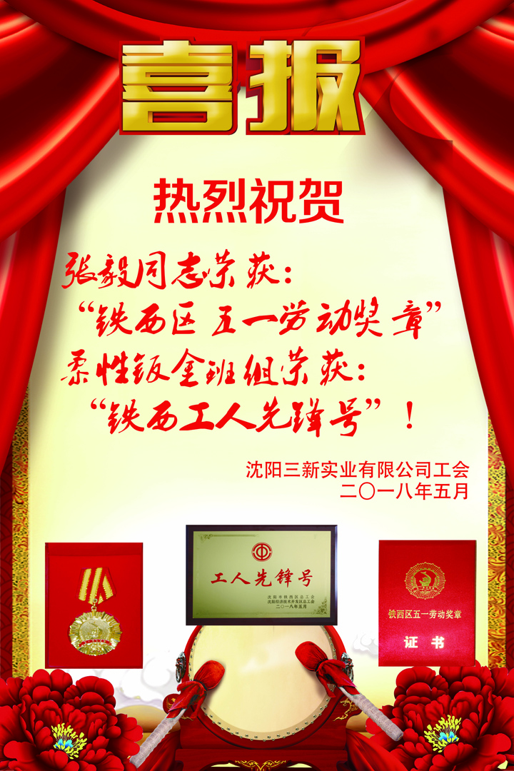沈陽(yáng)三新實(shí)業(yè)有限公司榮獲“鐵西五一勞動(dòng)獎(jiǎng)狀”,張毅同志榮獲“鐵西區(qū)五一勞動(dòng)獎(jiǎng)?wù)隆保嵝遭k金班組于永欣等9名同志榮獲“鐵西工人先鋒號(hào)”!