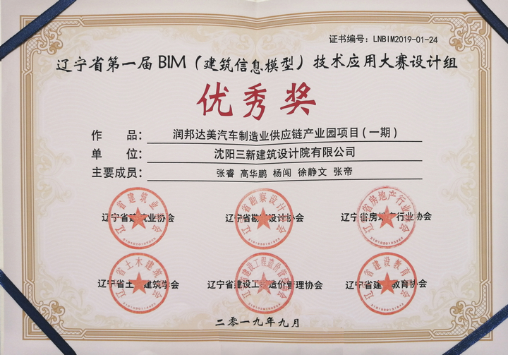 2019年10月18日,“遼寧省第一屆BIM(建筑信息模型)技術(shù)應(yīng)用大賽”召開了頒獎大會,頒發(fā)獎牌及榮譽證書。我公司由張睿、高華鵬、楊闖、徐敬文、張帝組成的BIM團隊提交的參賽項目《潤邦達美汽車制造業(yè)供應(yīng)鏈產(chǎn)業(yè)園項目(一期)》斬獲遼大賽優(yōu)秀獎。