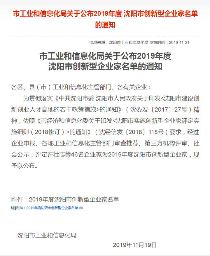 2019年11月19日,洪長禧總經(jīng)理被沈陽市經(jīng)信委授予2019年度沈陽市創(chuàng)新型企業(yè)家稱號。這是對我公司一直以來實施創(chuàng)新戰(zhàn)略成果的肯定,也是對于總和洪總領導下以設計研發(fā)人員和技術(shù)人員為代表的全體員工創(chuàng)新精神的褒獎!