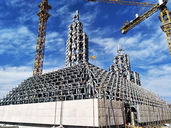 黃帝問(wèn)道大項(xiàng)目是“帝師之鄉(xiāng)”汝州的重點(diǎn)大型城雕項(xiàng)目,也是當(dāng)?shù)氐貥?biāo)性建筑。該項(xiàng)目肩負(fù)著弘揚(yáng)汝州歷史文化和華夏文明的重任,承載了太多榮耀和希冀。雕像基底面積1400平方米,人像總高度59.8米,主體結(jié)構(gòu)采用圓管鋼框架,外側(cè)采用干掛石材雕塑,總用鋼量2300噸,設(shè)計(jì)使用年限為100年。雕塑內(nèi)部水、電、消防配套齊全。要用鋼結(jié)構(gòu)、石塑傳神地塑造中華民族敬為人皇的黃帝雕像,不失神韻和靈氣,其難度可想而知。三新不負(fù)重托,攻克所有的技術(shù)難題,把大師畫卷中的意象用建筑語(yǔ)言完美呈現(xiàn),體現(xiàn)了三新建筑技術(shù)與藝術(shù)完美融合的建筑理念。施工過(guò)程中汝州市政府各級(jí)領(lǐng)導(dǎo)多次到現(xiàn)場(chǎng)檢查指導(dǎo),對(duì)工程質(zhì)量贊賞有加。我們一起見(jiàn)證了精品的煉成,其中凝聚了三新人的心血和智慧,更體現(xiàn)了三新的創(chuàng)新精神。如今被評(píng)為“中國(guó)鋼結(jié)構(gòu)金獎(jiǎng)”工程,更是實(shí)至名歸。三新帶您一睹黃帝風(fēng)采,領(lǐng)略華夏文明。