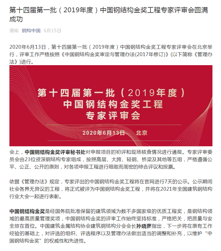 2020年6月13日,第十四屆第一批(2019年度)中國(guó)鋼結(jié)構(gòu)金獎(jiǎng)工程專家評(píng)審會(huì)在北京舉行。