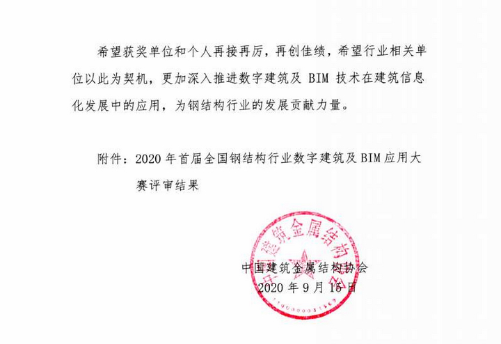 本次大賽由中國建筑金屬結構協(xié)會鋼結構分會承辦,旨在推進數(shù)字建筑及BIM技術在建筑信息化發(fā)展中的應用,深化BIM技術在鋼結構工程中的實踐,創(chuàng)新BIM專業(yè)技術人才培養(yǎng)機制。大賽對于提高我國建筑業(yè)建筑信息模型技術的應用水平,實現(xiàn)真正意義上轉型升級,提升工程質量和效率、降低造價和節(jié)約資源,推動技術創(chuàng)新、質量創(chuàng)優(yōu)和人才隊伍建設有著積極的推進作用。同時相信隨著BIM應用的進一步展開,我公司的裝配式建筑發(fā)展將如虎添翼,我司 BIM團隊會取得更加優(yōu)異的成績!