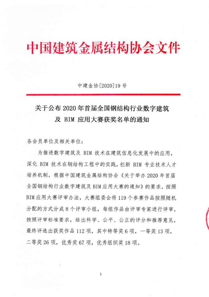 由中國建筑金屬結構協(xié)會主辦的《2020年首屆全國鋼結構行業(yè)數(shù)字建筑及BIM應用大賽》評審結果于2020年9月15日揭曉。我公司由張睿、高華鵬、楊闖、徐敬文、張帝組成的BIM團隊提交的參賽項目《潤邦達美汽車制造業(yè)供應鏈產(chǎn)業(yè)園項目(一期)》斬獲大賽優(yōu)秀獎。