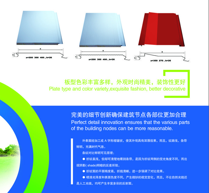 SX-400幕墻板系列是公司長期設計、施工實踐的結晶,工藝成熟、先進,外觀時尚、美觀。采用獨特創(chuàng)新的專利掛件結構型式以及完美的細部節(jié)點設計,確保墻面、墻角全無釘;板與掛件的連接更牢靠,安裝更快捷。